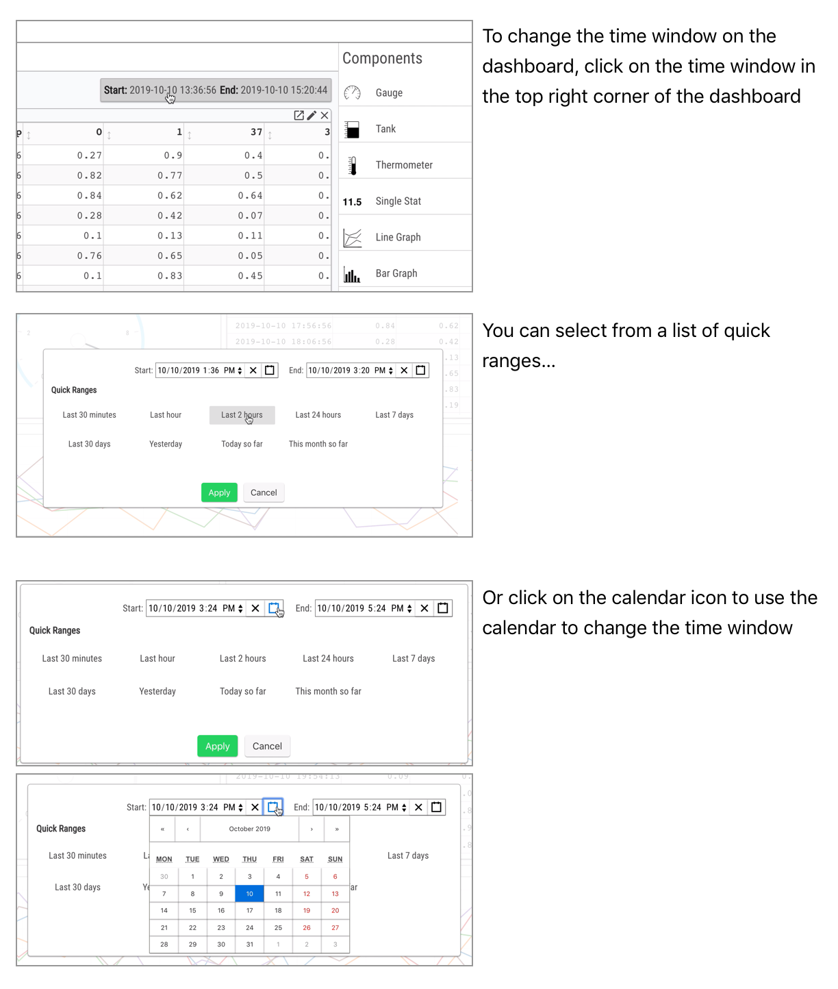 The current value of Start and End in the Time Window determines the time range for which data is displayed in all Panels in the Dashboard