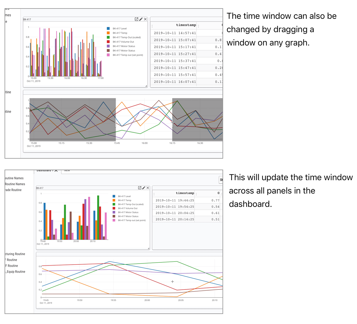Figure 21: Change the Time Window for a PlantExplorer Dashboard by zooming to a specific time range on a Chart. After the zoom, the Time Window changes and all Panels in the Dashboard are updated¶
