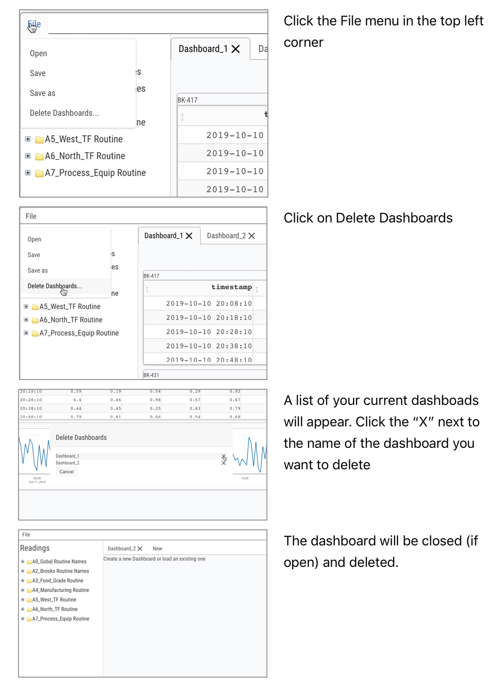 File-level operations (save, open, delete) on a Dashboard are accessible via the File menu in the top left of the interface (just above the Readings list)