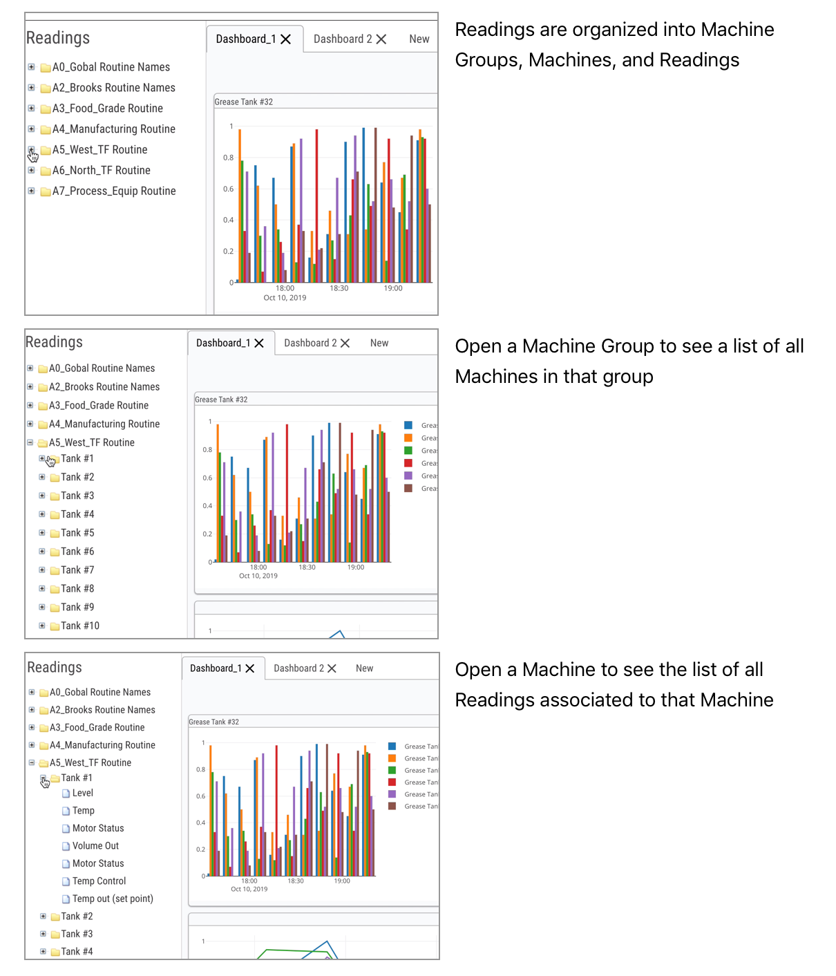 You can expand the machine group or machine level readings by clicking on the + indicator to the left of the folder icon