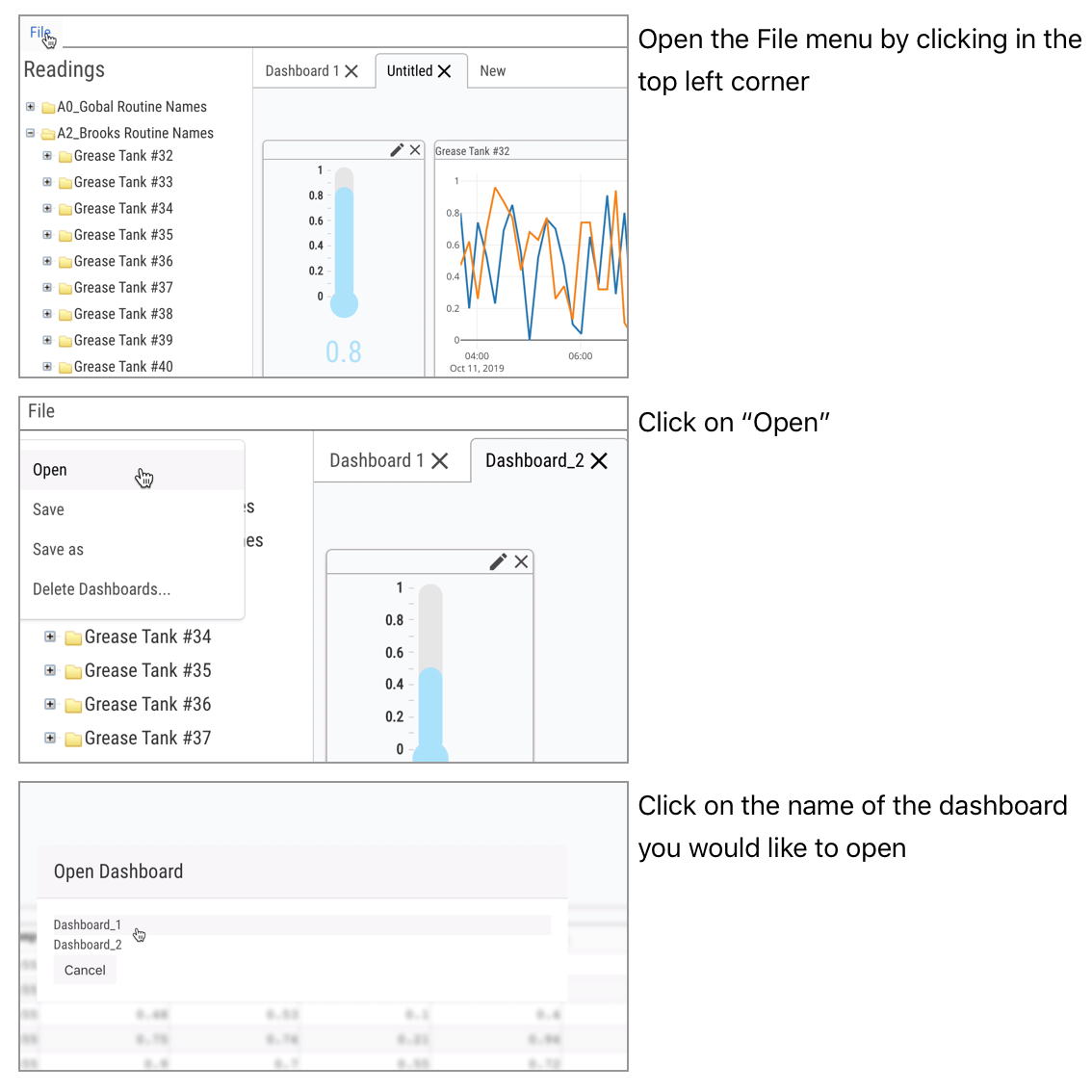 Clicking Open from the File menu will open a modal sub-window with a list of previously saved Dashboards, using the name previously supplied to identify each Dashboard