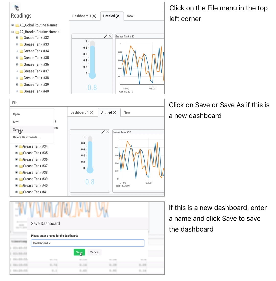 When File is clicked, a menu will open that allows you to open, save, save as (save with a supplied name), and delete Dashboards
